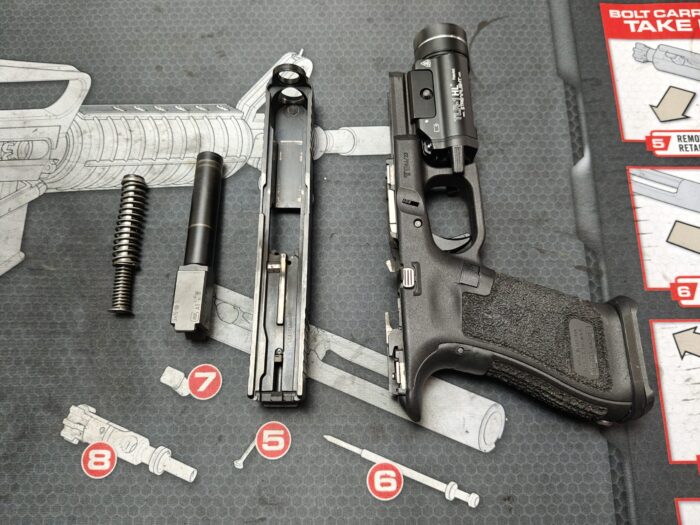 Do bieżącego czyszczenia wystarczy rozłożyć pistolet do podstawowych elementów tj. szkielet, zamek, lufa i sprężyna powrotna. Jeżeli chcesz pójść o krok dalej i rozkładać zamek ze szkieletem, będą Ci do tego potrzebne odpowiednie narzędzia. Będzie to m.in. zestaw wybijaków, śrubokręty haczykowe oraz mały młoteczek.