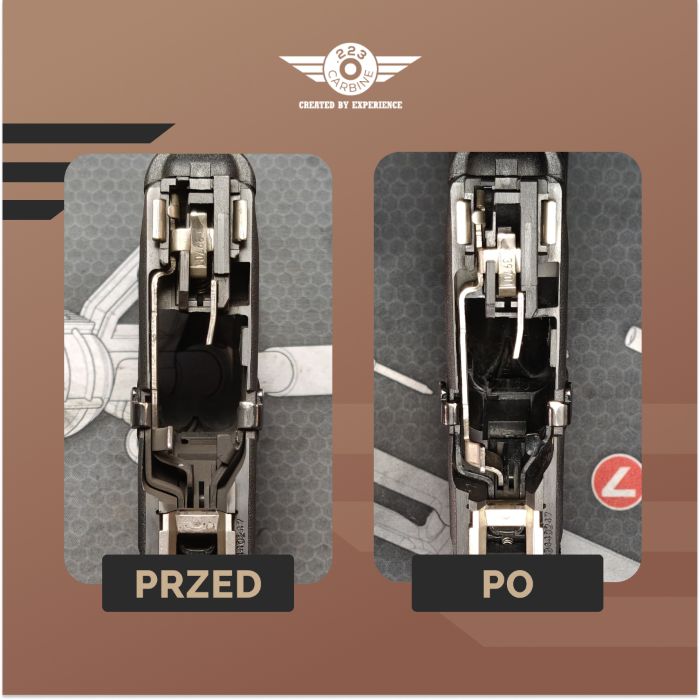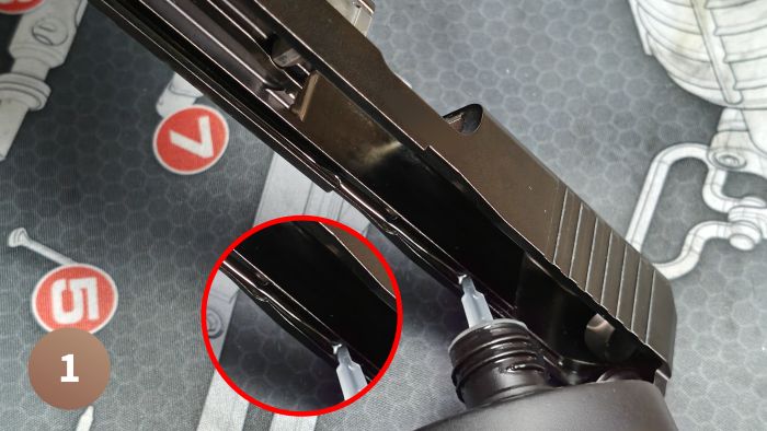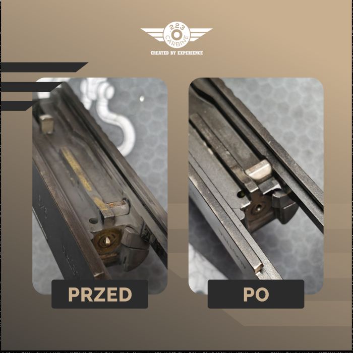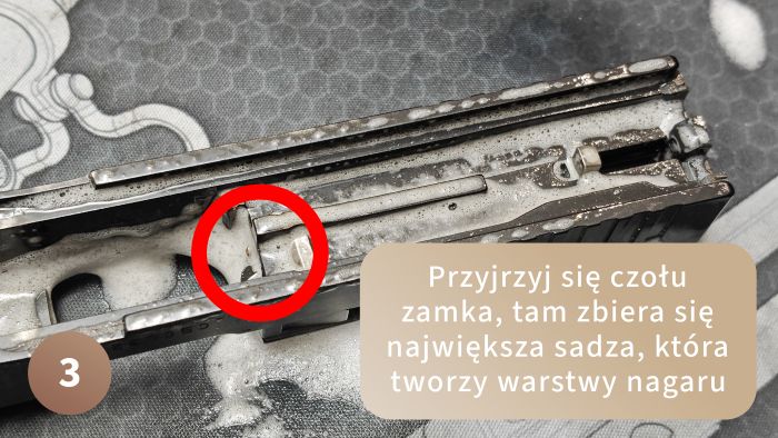 Czoło zamka – miejsce, które omija większość osób, które czyszczą pistolet. W szczególności okolice pazura wyciągu, a to właśnie tam zbiera się największy syf. Oprócz tego, standardowo przykładamy uwagę na wyszczotkowanie całej powierzchni oraz prowadnic, na których pracuje zamek – one muszą być czyste, żeby zamek gładko pracował podczas strzelania.