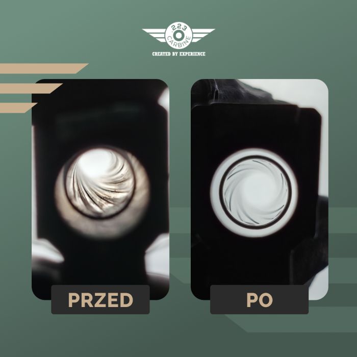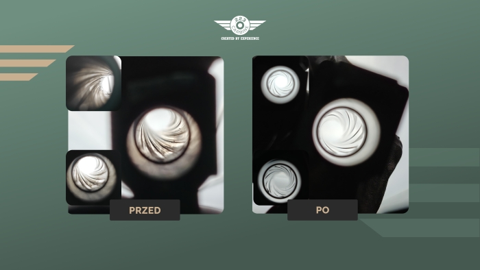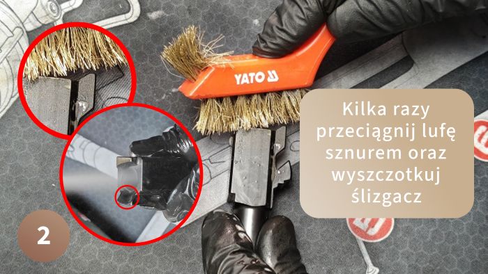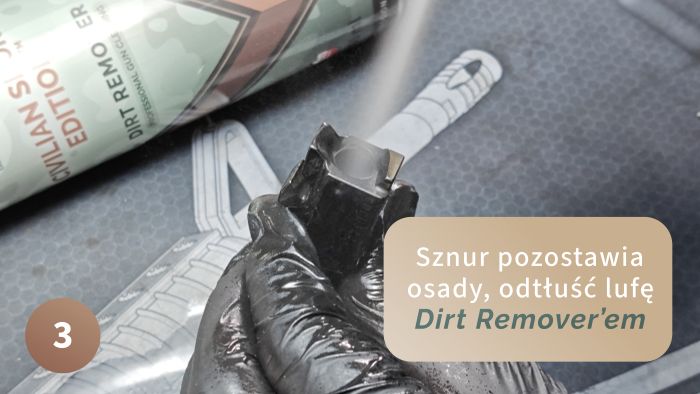 Jeżeli jesteś na tym etapie, Active Foam zdążyła już zareagować, więc przeciągamy lufę 2-3 razy sznurem. Oprócz tego doprowadzamy ślizgacz do lśnienia. Ślizgacz – pochylnia po której jest wprowadzany nabój do komory. Na sam koniec spryskaj lufę Dirt Remover’em, zadziała jak odtłuszczacz i zostawi idealnie czystą i suchą lufę.