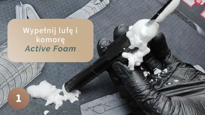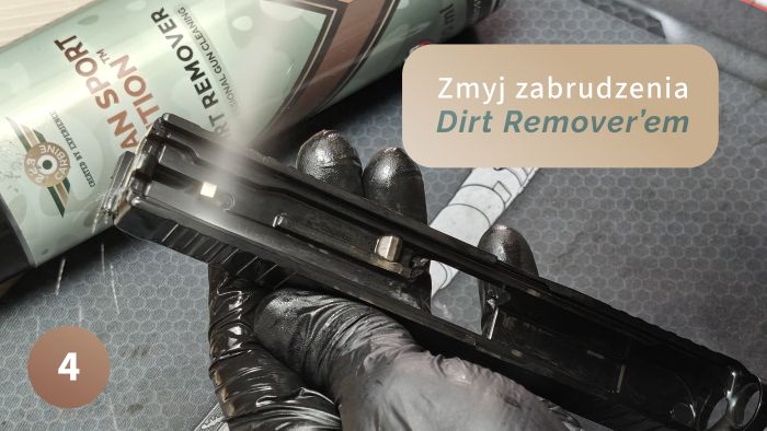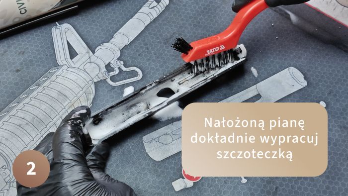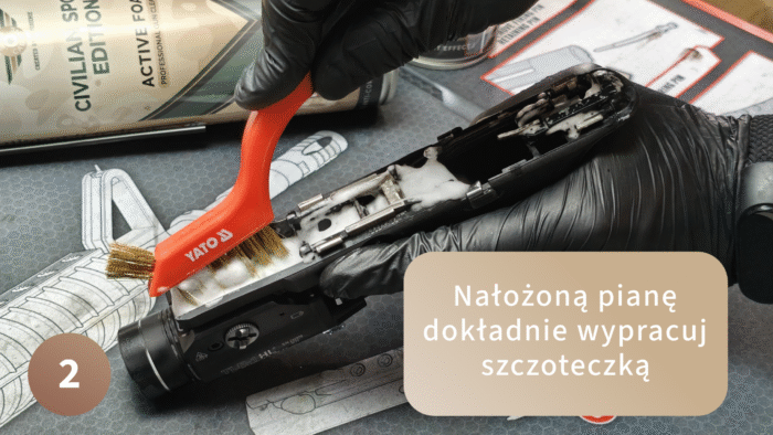 Zwróć uwagę na dokładne wyszczotkowanie mechanizmu spustowego. Każda drobina niedopalonego prochu i nagaru może mieć wpływ na pracę spustu. Nie bój się szczotkować tego miejsca! Szorujemy aż cała piana zniknie i zostanie sam płynny brud. Wszystko to potem wypłuczesz Dirt Removerem do sucha.
