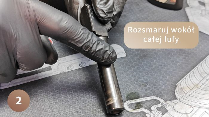 Lufę smarujemy tylko od zewnątrz wokół koła oraz dosłownie przecieramy palcem rygiel – tam też jest tarcie i warto je trochę zredukować. Nie wpuszczaj oleju do środka lufy, jeśli nie zamierzasz odstawiać pistoletu na kilka lat bez strzelania! Lufa ma być SUCHA. Wpuszczanie oleju do środka lufy spowoduje przyklejanie kurzu i brudu w środku co podczas strzału zadziała jak ścierniwo. Dodatkowo podczas strzelania z mokrą lufą będzie się wydzielać sporo dymu i smrodu.