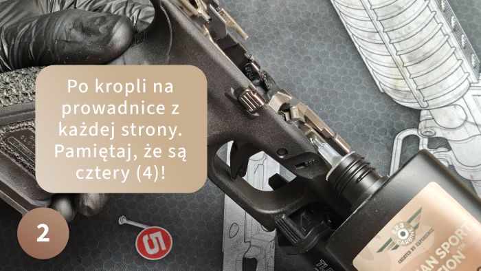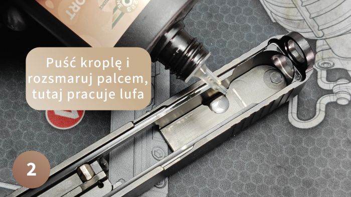 Złóż pistolet i energicznie przeładuj kilka razy, aby rozprowadzić zaaplikowany olej. Spływający nadmiar wytrzyj czyściwem. Tak przygotowana broń odwdzięczy Ci się płynniejszą, bardziej kulturalną pracą, łagodniejszym działaniem języka spustowego, a co najważniejsze – spokojną głową i zastrzykiem dopaminy na widok zadbanej broni. W końcu chcemy czuć się pewnie, trzymając ją w rękach.