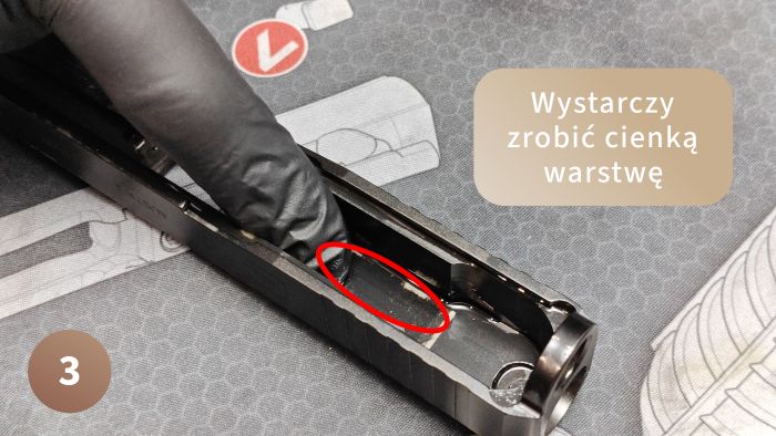 W zamku już jest nieco łatwiej, mamy do smarowania dwie prowadnice oraz górną część zamka, gdzie pracuje lufa. Obie prowadnice smarujemy prawie po całej długości zostawiając kilka cm od przodu i tyłu (jak złożysz pistolet, wszystko się rozsmaruje do końca). Dodatkowo puszczamy kroplę/dwie na górną część i rozsmarowujemy palcem na gładki film, nadmiar ściągamy czyściwem. W tym miejscu lufa intensywnie pracuje, dlatego potrzebne jest smarowanie.