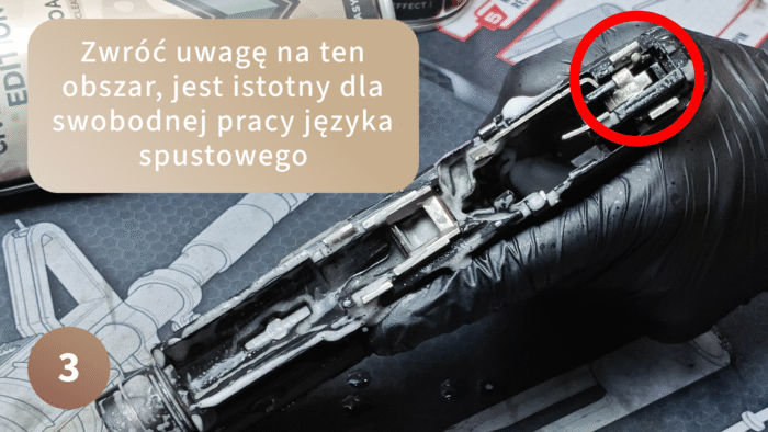 Najważniejsze elementy do smarowania w szkielecie to: prowadnice (szyny) zamka. W zależności od modelu broni, warto stworzyć film olejowy na: krawędzi przerywacza oraz krawędzi szyny spustowej, która wypycha zabezpieczenie przeciwwstrząsowe – na tych elementach wystarczy zrobić bardzo cienki film olejowy, czyli rozprowadzić kropelkę Firearm Oil na palcu, rozetrzeć palcem oraz dotknąć wymienionych części. Optymalnie warto też wpuścić kroplę na sprężynę spustową.