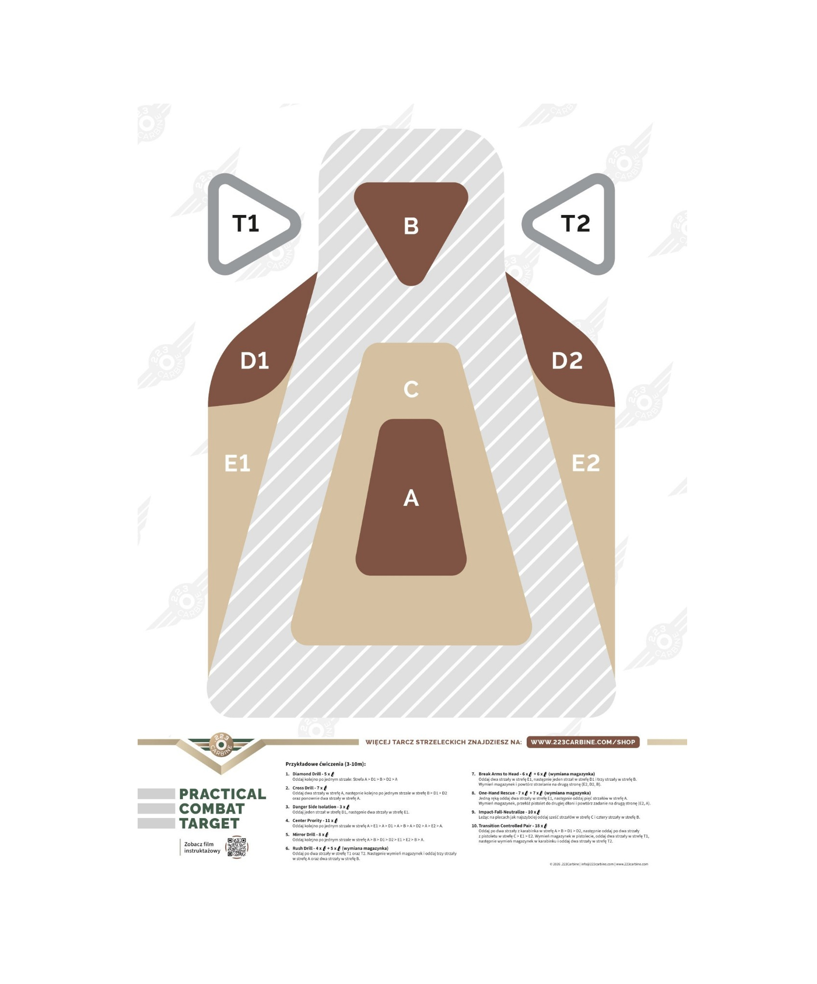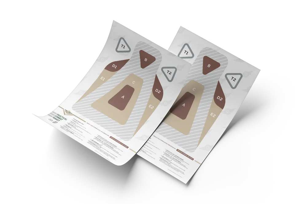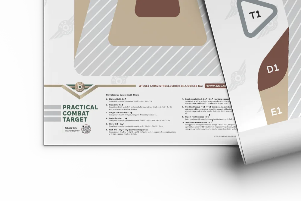 Practical Combat Target łączy realizm treningowy z odpowiedzialnym i przemyślanym podejściem do formy wizualnej, dostosowanej do potrzeb współczesnego strzelectwa cywilnego. Na dole tarczy znajduje się 10 różnych przykładowych zadań strzeleckich, które może wykonać każdy strzelec podczas treningu.